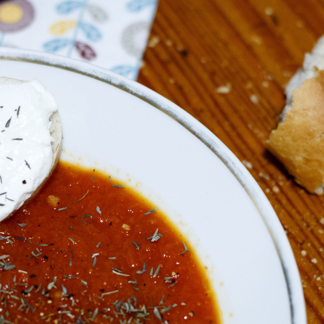 Als ich am Nachmittag mit der Zubereitung beginnen wollte, habe ich erst gemerkt, wie lange die Ofen- und Kochzeiten sind und mir ausgerechnet, dass ich dann das Foto gar nicht mehr bei Tageslicht schaffen würde. Also kamen die Tomaten nur die Hälfte der angegebenen Zeit ins Rohr und dafür bei doppelter Temperatur, was auch gut geklappt hat. Die Chili habe ich vor dem Kochen probiert, habe ihre Schärfe dann aber unterschätzt, so ist meine Suppe wirklich sehr, sehr scharf geworden - aber ich esse gerne scharf, so war das voll ok. Ich habe einfach noch ein bisschen Sauerrahm darunter gemischt.