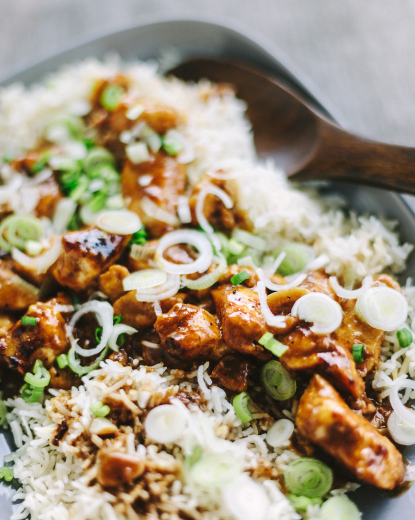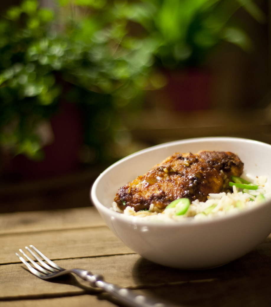 Beim Reis habe ich eine Abkürzung in Form meines kleinen Reiskochers eingeschlagen und nur "normalen" Basmatireis gemacht (denn ich mag keine Petersilie). Dafür habe ich kleingeschnittene Frühlingszwiebeln später über das ganze Gericht gestreut.