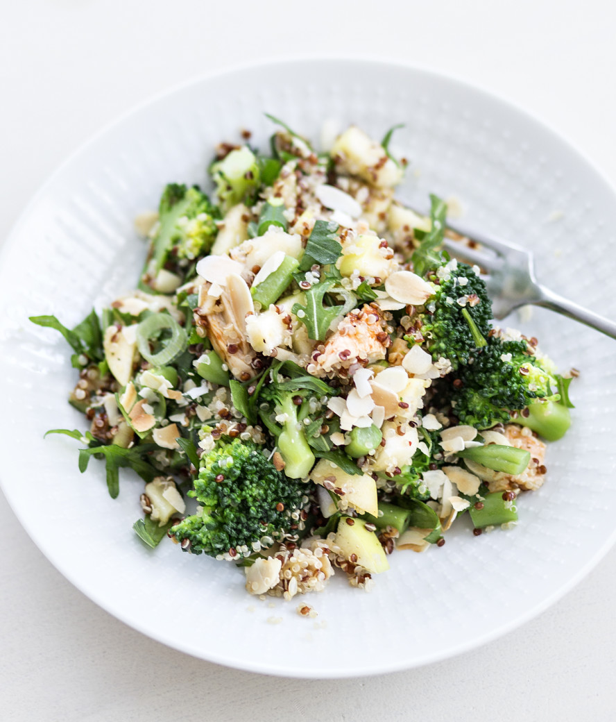 Ein zweites Mal erstaunt war ich dann, als ich herausgefunden habe, dass dieser Supermarkt keine grünen Paprika mehr verkauft, weil die Kunden anscheinend nur gelbe und rote kaufen wollten. (Um bei der schönen grünen Farbe des Salats zu bleiben, habe ich statt Paprika dann einen grünen Apfel gekauft und später noch klein geschnittene grüne Bohnen ergänzt, was super gepasst hat.)
