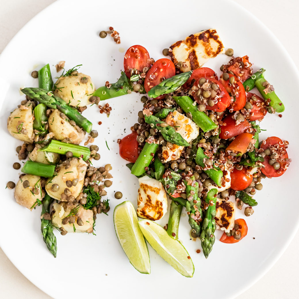 Quinoa, Linsen, grüner Spargel, Tomaten, Minze und Halloumi - alles Zutaten, die ich sehr sehr gerne mag - da konnte ja quasi nichts schief gehen. Und da ich noch Linsen und Spargel übrig hatte, habe ich auch noch eine Variante von dem Kartoffel-Spargelsalat auf der Seite davor gemacht, (leider ohne Kapern und Brunnenkresse, weil ich die nicht zufällig zu Hause hatte.)
