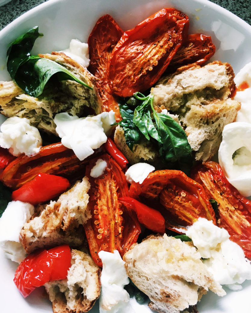 Zuerst habe ich mir nichts Grosses erwartet, weil ich dachte, dass Tomate, Basilikum und Mozzarella halt so ein Klassiker ist. Aber diese Zubereitung mit den Flaschentomaten für so eine lange Zeit im Ofen und dem knusprigen Brot und dem Büffelmozarella (der sein Geld echt wert ist!) war doch nochmal eine Steigerung. Diese Gericht lebt von der Qualität der verwendeten Zutaten.